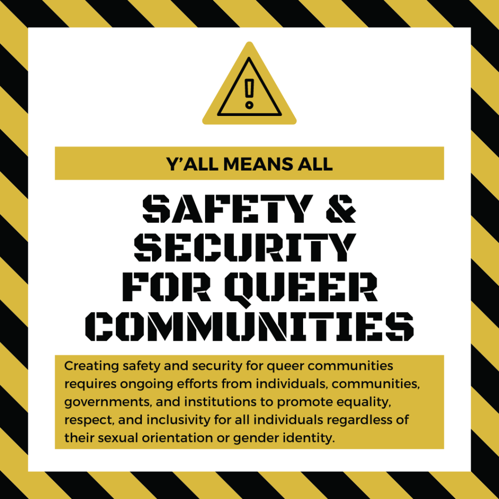 Creating safety and security for queer communities requires ongoing efforts from individuals, communities, governments, and institutions to promote equality, respect, and inclusivity for all individuals regardless of their sexual orientation or gender identity.